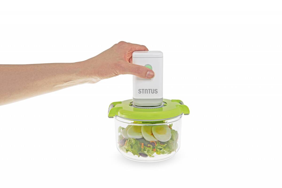 Rechargeable electric pump automatically removes the correct amount of air from any Status vacuum container.
